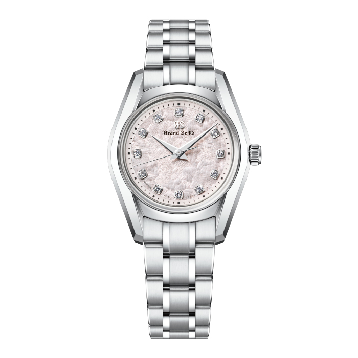 「62GS」の中でも高い支持を得ている「花筏(はないかだ)」に、26mmスモールサイズのクォーツモデルが加わりました。1967年発売のグランドセイコー史上初の自動巻機械式モデル「62GS」を現代的にアレンジした「62GS現代デザインモデル」をベースとし、日本特有の季節の移ろいをダイヤルで表現したモデルです。ベゼル(ガラス縁)のない構造によって広々と見えるダイヤルや、ザラツ研磨によって実現したシャープな多面体からなるケースが魅力です。ダイヤルは、風に舞い散った桜の花びらが川の水面を覆う「花筏」の情景を表現しています。ケースデザインは、小さいながらも高い着用感・視認性を確保。シンメトリーに配したダイヤモンドが生み出す、華やかで心地よいダイヤルに仕上げました。ムーブメントは、年差±10秒のクォーツ「キャリバー4J51」を採用しています。